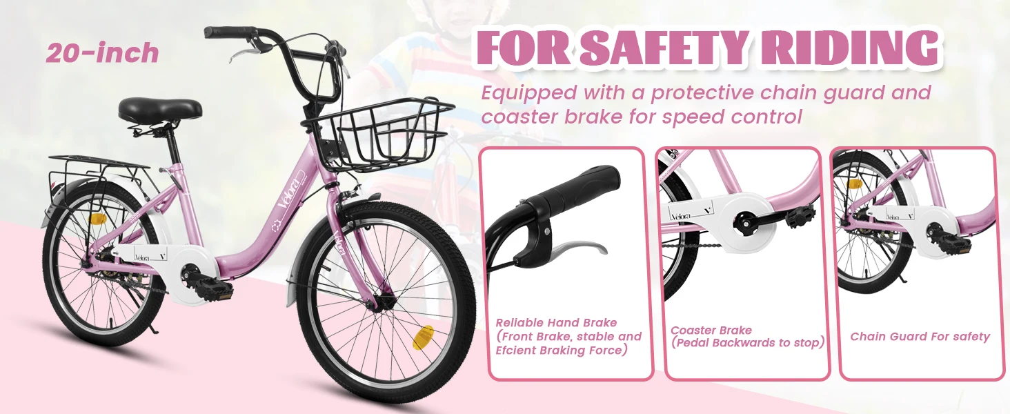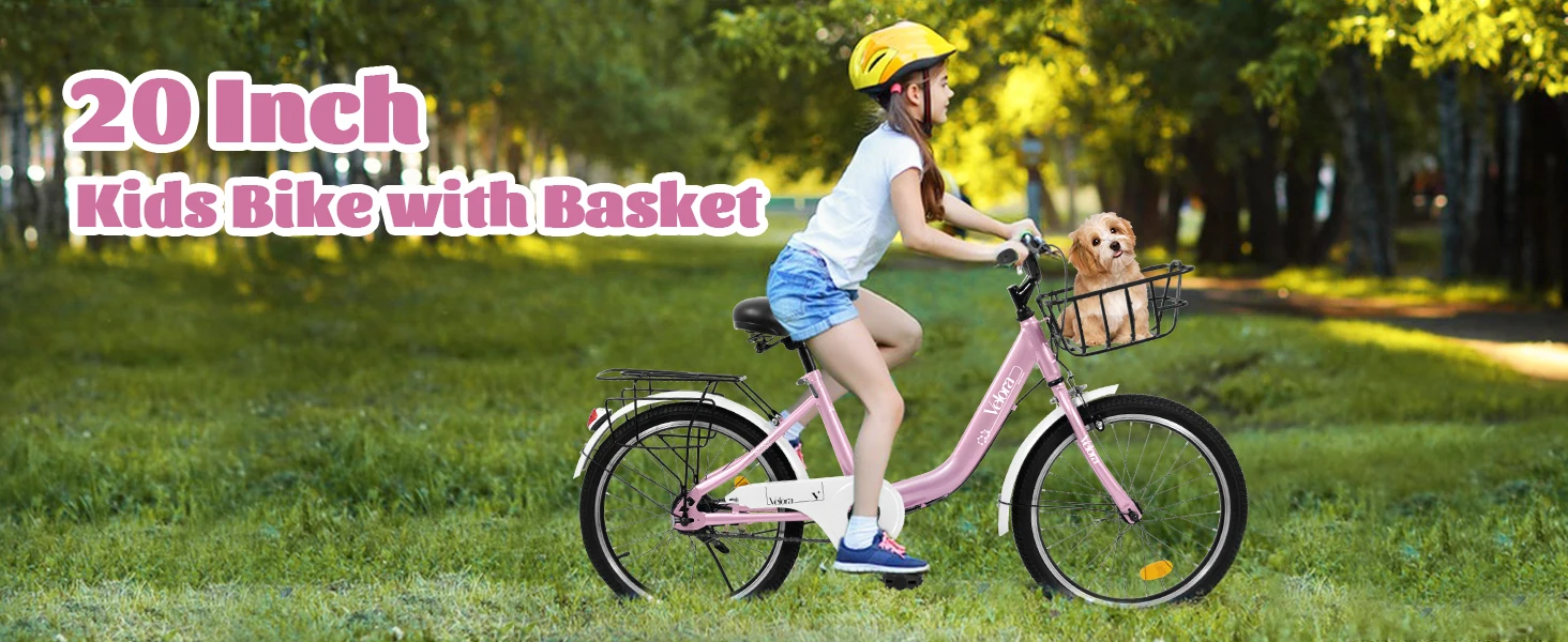 20 Inch Kids Bike for Boys Girls, 1 Speed Kids Bicycle with Basket, Rear Seat, Chain Guard, Coaster Brake, V-Brake, Steel Frame