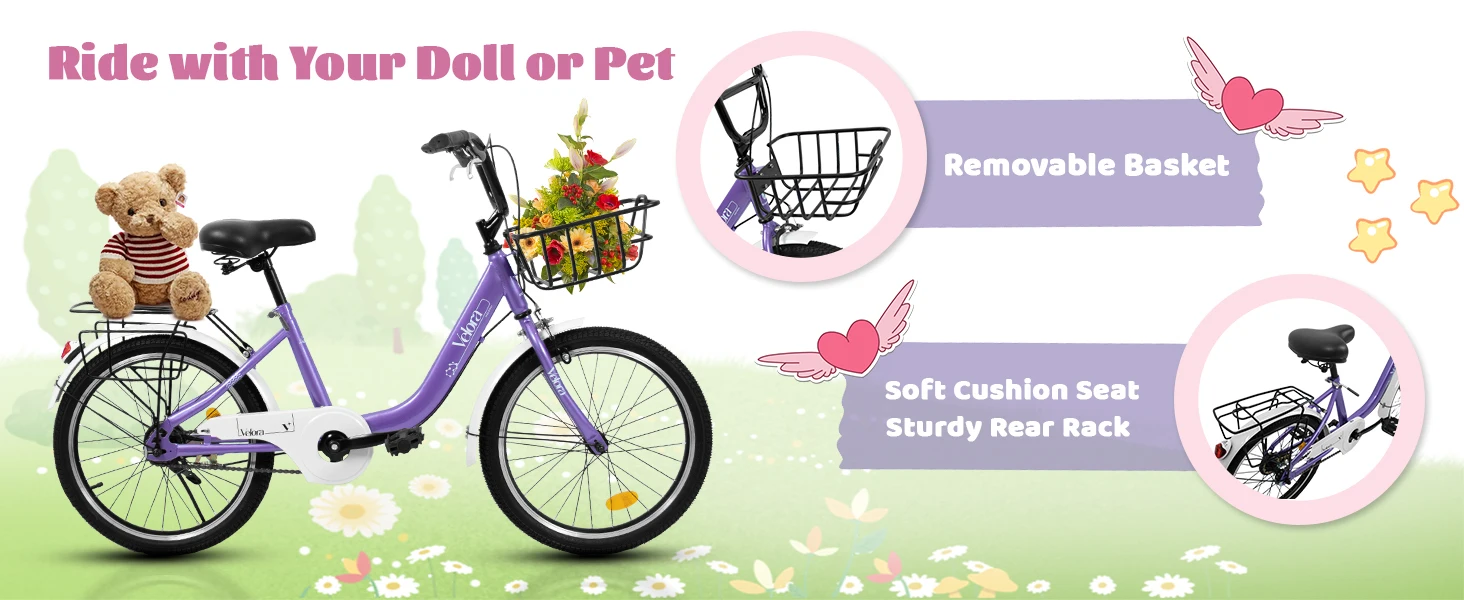 [Practical & Kid-Friendly Features] Designed with convenience in mind, this bike includes a front basket for carrying toys or snacks, a rear seat for stuffed animals, and a full chain guard to protect little legs and clothes from snags. The flat handlebars promote better posture and steering, making it comfortable for extended rides.