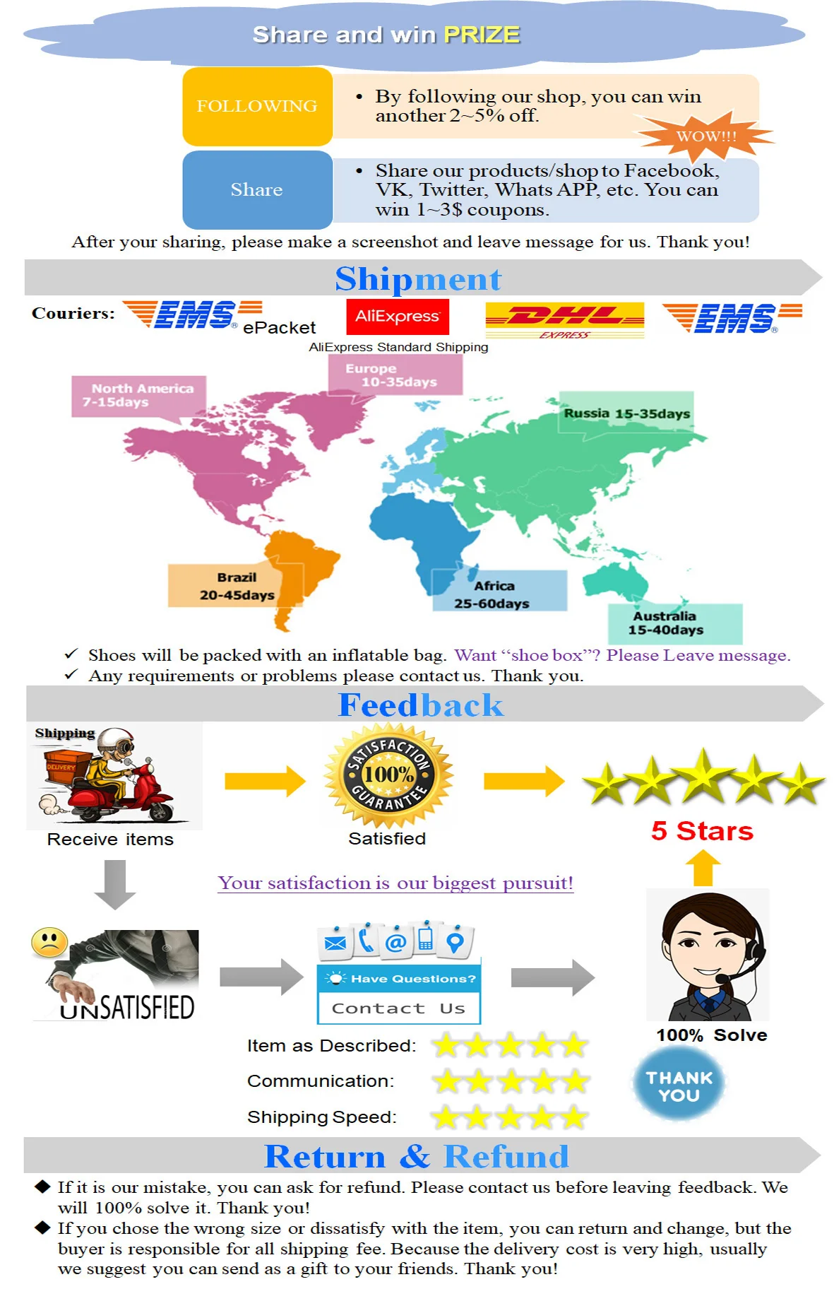 ①New shoes may come with a little smell,it will be better after ventilation.