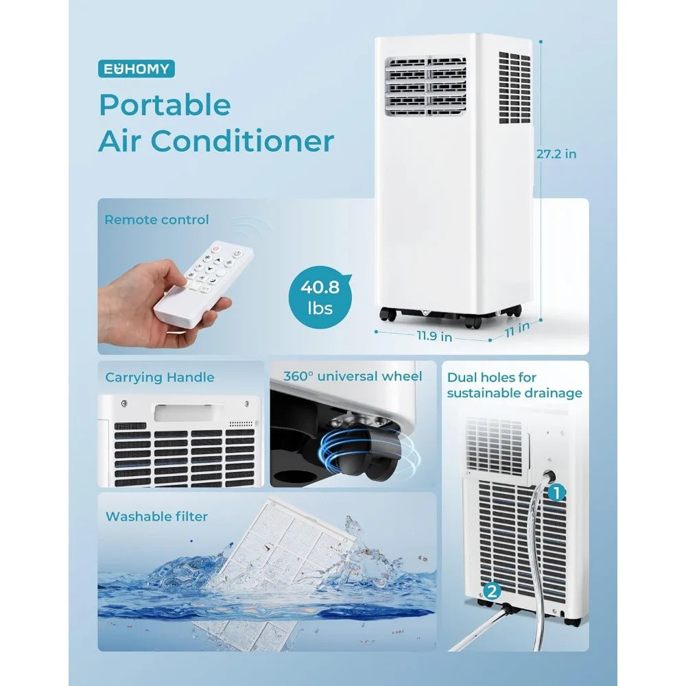 MODERN & THOUGHTFUL DESIGN: The small air conditioner measures 12*26.7*11.4 in and has 360° universal wheels and a portable handle. You can place it anywhere in your home. This indoor air conditioner is designed with 2 drainage holes at the bottom and middle, you can choose the appropriate drainage method. The stand-up AC also has a washable filter and no rotating fan blades, which can protect children's health and prevent them from getting cut