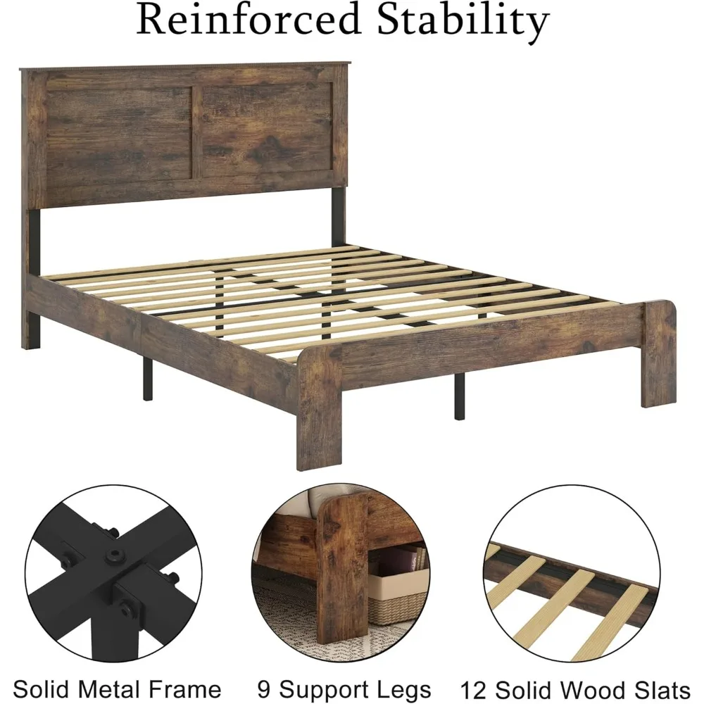 Bed Frame, Rustic Vintage Platform Bed Frame with Wood Headboard and Footboard, 12 Wood Slats Support