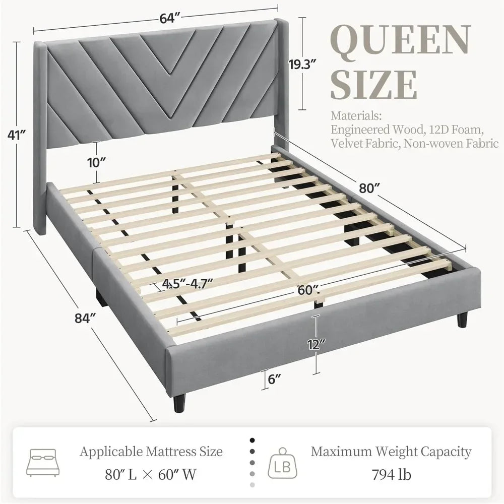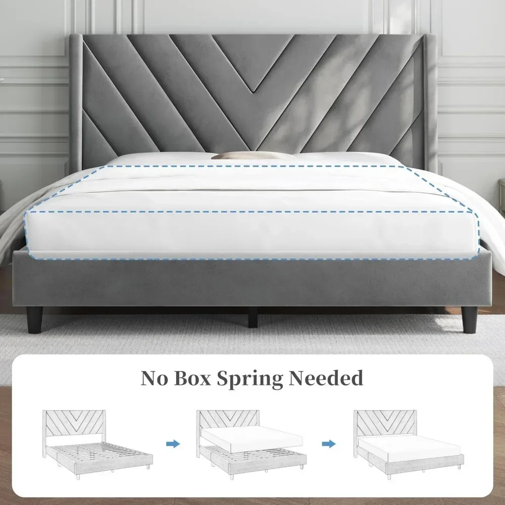 Wing Side Design: Designed with a wing side on the wide upholstered headboard and skin-friendly velvet fabric, the queen bed frame can be a must-have in any restful retreat. (No Box Spring Needed)