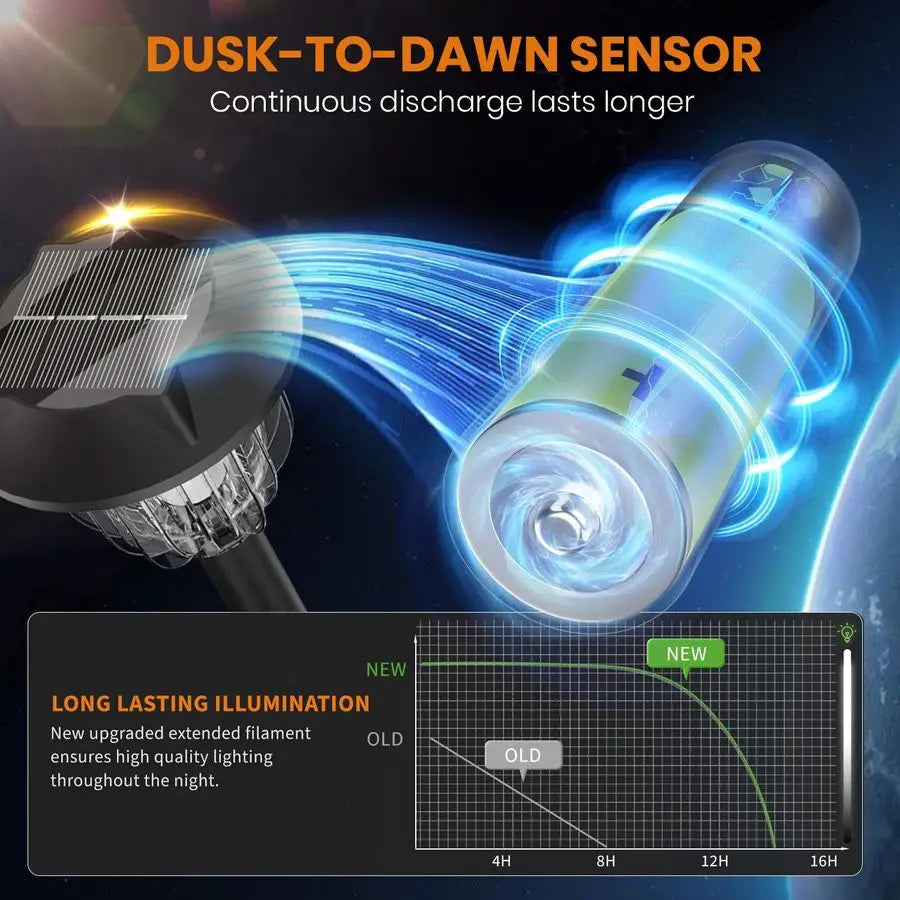 SOLAR LANDSCAPE LIGHTS Our upgraded solar pathway lights draw inspiration from the cosmos, boasting a unique and durable construction. The sleek and modern design effortlessly complements the surrounding landscape, creating a lovely ambiance. Bringing a touch of magic to your garden and creates a warm and inviting atmosphere. Solar outdoor walkway lights are designed to provide an attractive pattern, lights up your garden at night.