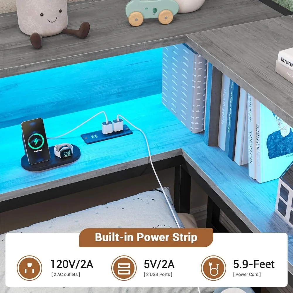 Corner Bed Frame with Storage Bookcase, Twin Daybed with Storage Drawers Underneath, Kids Bed Unit with Charging Station