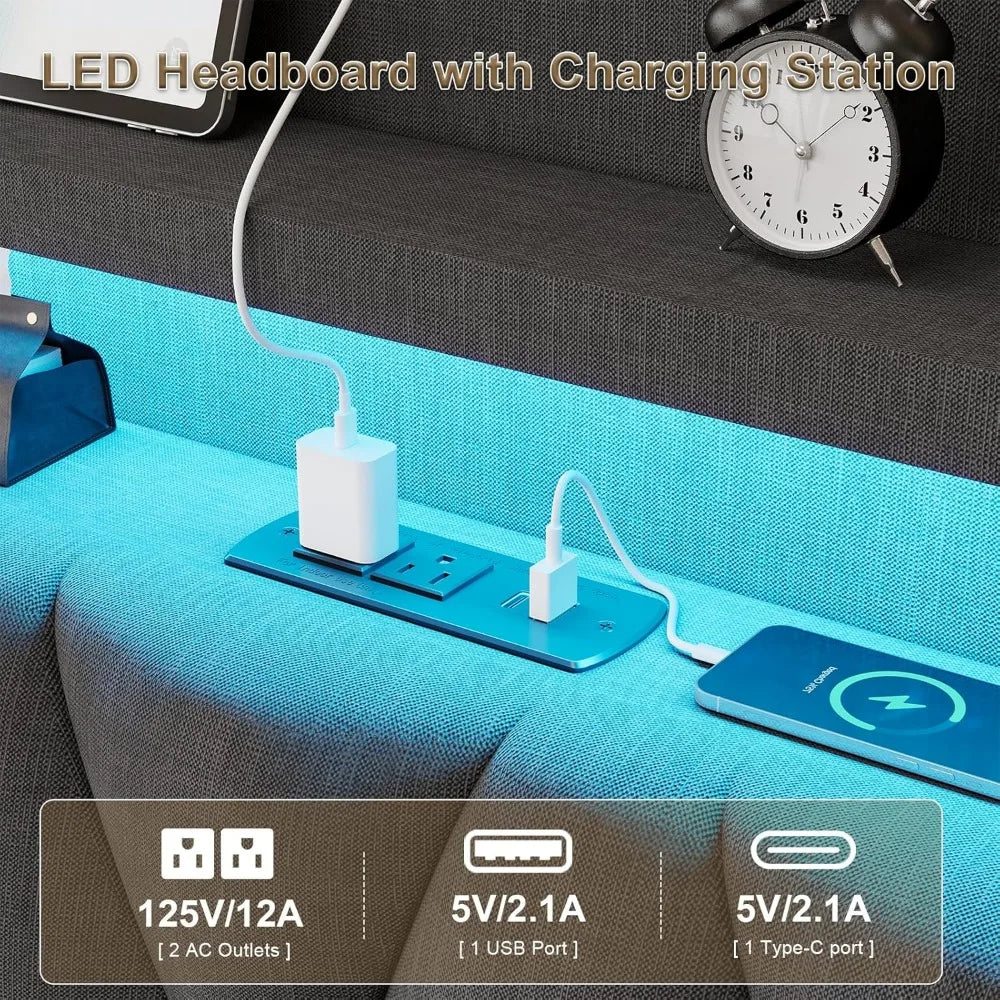 Floating Bed Frame King Size with Hidden Storage Space and Headboard, LED Lights & Charging Station, Platform Floating King Bed