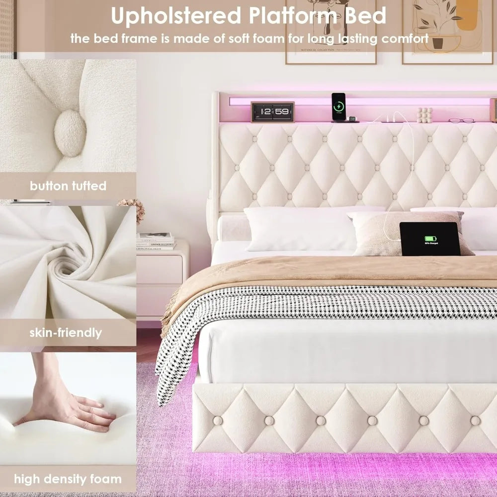 Floating Bed Frame Queen Size Platform with LED Lights, USB Charging Station Headboard Modern Upholstered Velvet Fabric Bed