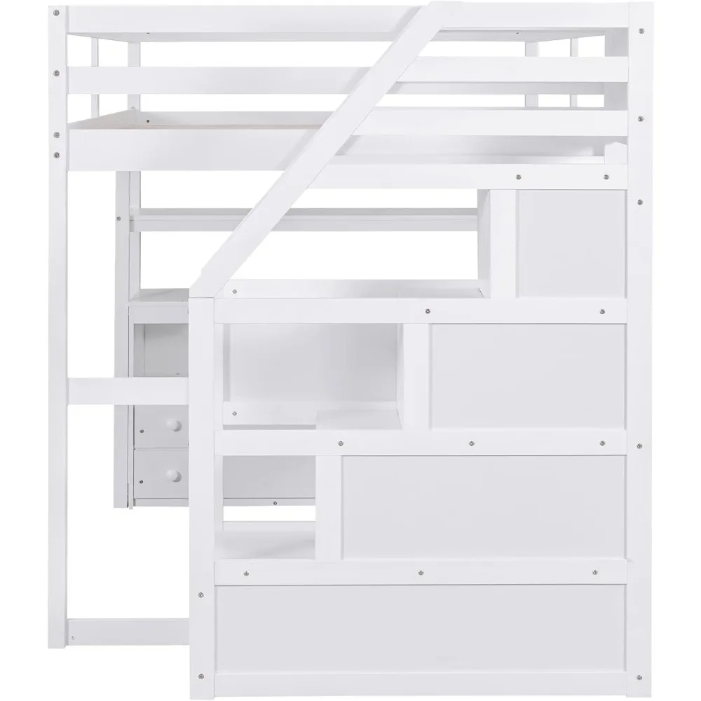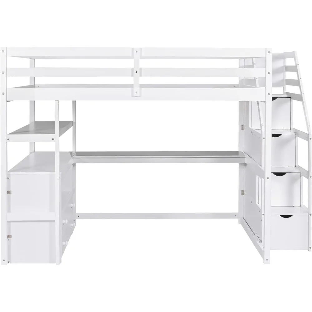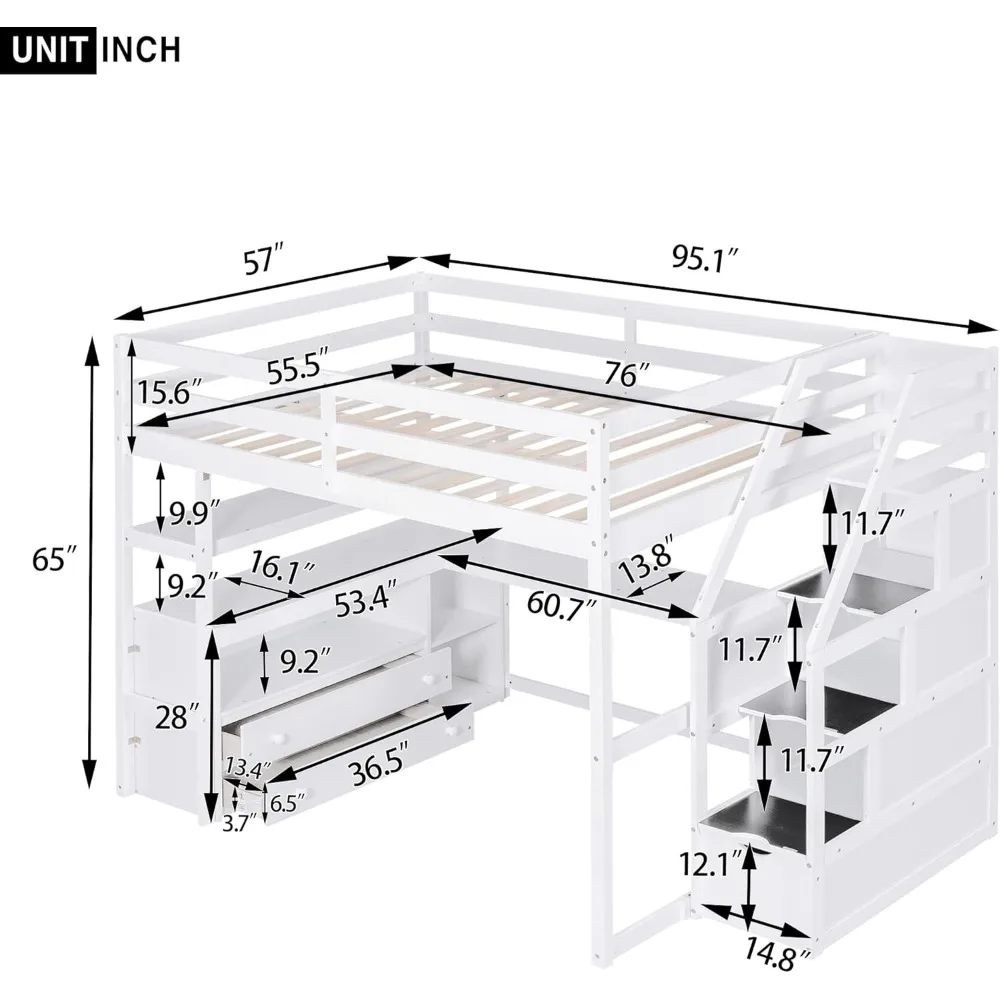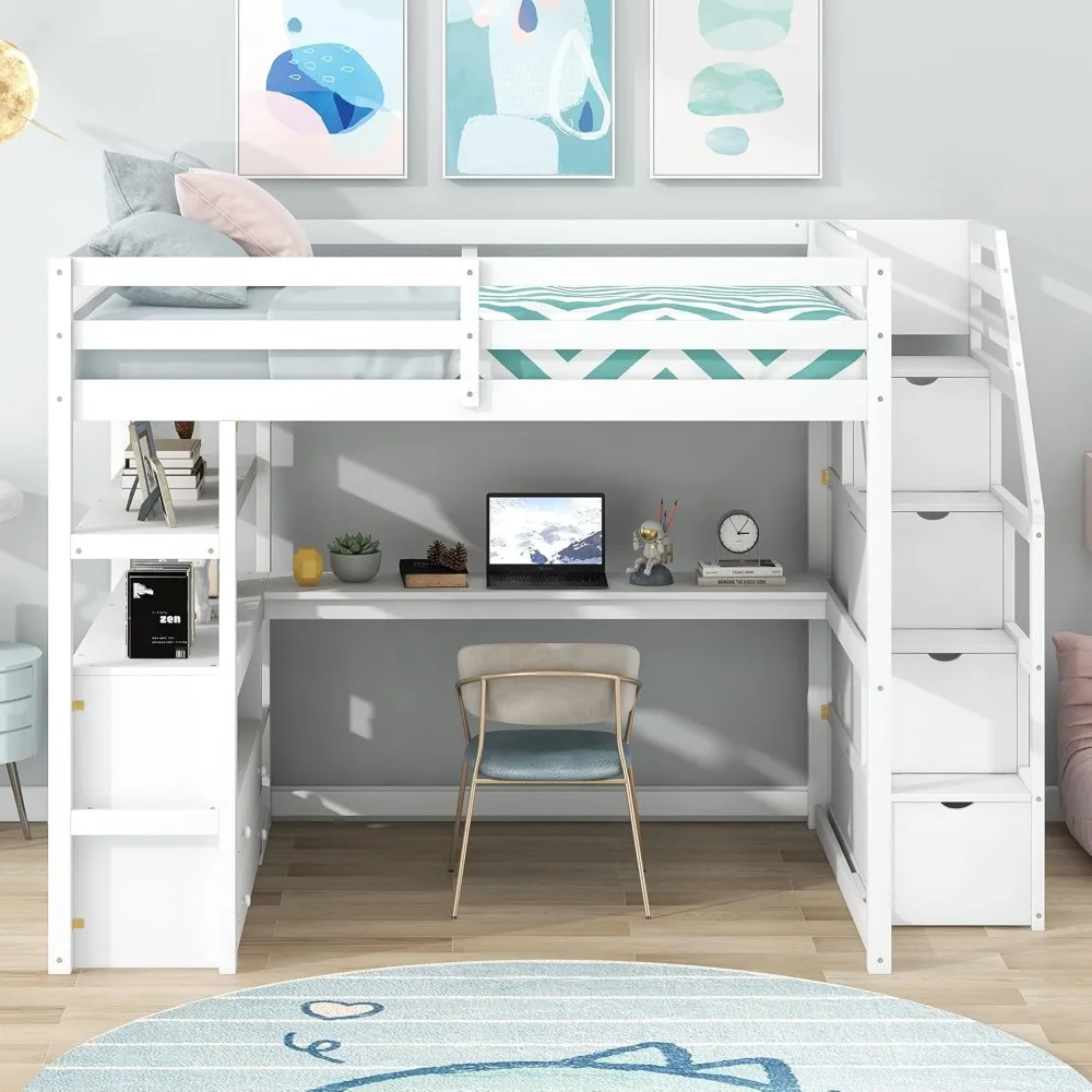 - 【Multifunctional Loft Bed Frame】 Our full size loft bed perfectly serves homes with limited space. This wooden loft bed includes a 60.7''Lx 13.8''W large desk, shelves, storage staircase and two large storage drawers in one. Spacious space under the bed is perfect for your kids to read, do homework or play and create their own world to be explored. And you can also work here, the perfect workstation is suitable for all families