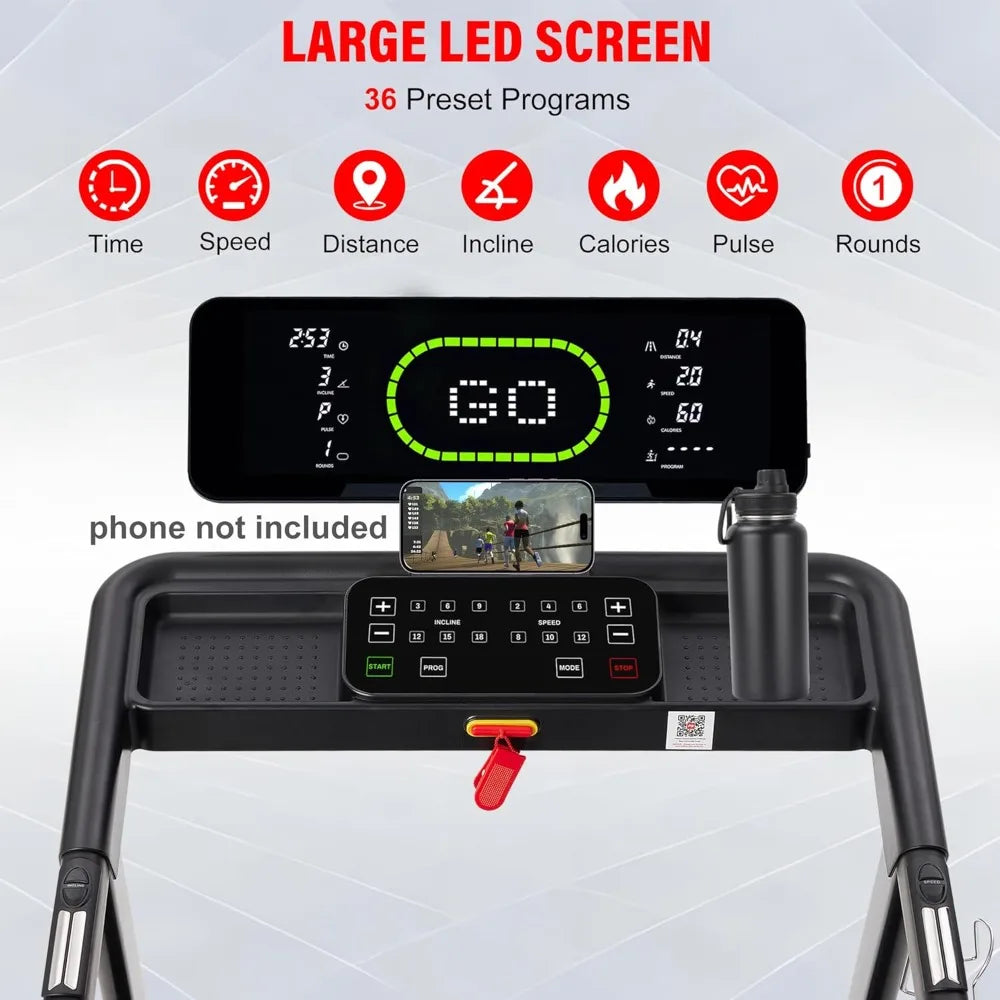 【Smart LED Display & 36 Preset Programs with Auto Incline】Stay on top of your training with a smart LED display showing Speed, Incline, Time, Distance, Calories, and Heart Rate. Treadmill auto incline lap tracking lets you visualize progress like a pro. Choose from 36 programs for fat loss, cardio, HIIT, or strength, making it one of the best treadmills for home fitness.