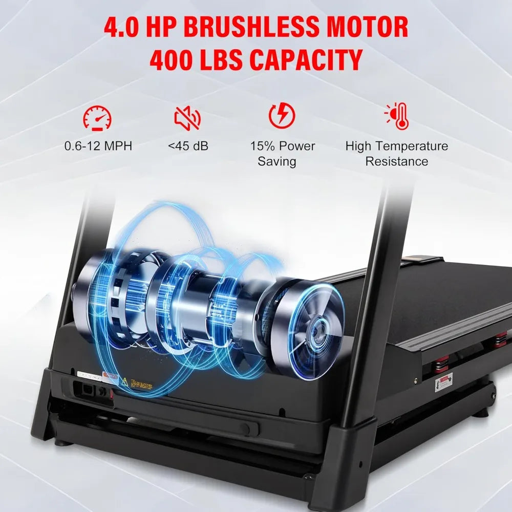 【Powerful 4.0 HP Motor & 400 lb Capacity Heavy Duty Treadmill】This heavy duty treadmill 400 lb capacity comes with a brushless 4.0 HP motor, supporting speeds up to 12 MPH. The ultra-quiet, friction-free motor ensures long-lasting performance, providing a premium home treadmill experience for you and your family.