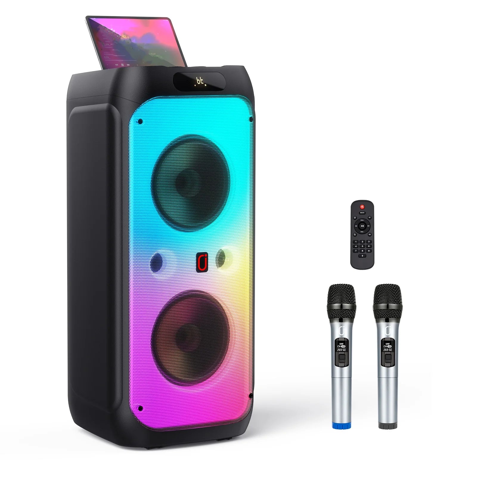 【Superior Sound Quality】: Enjoy your music with this big party speakers with PA system,Treble and Bass adjustment. With a huge dimensions of 33x15.5x14.5 inches, a 600watt peak powerful output, dual 8" subwoofers and two 3" tweeters, it delivers super loud and clear 3D stereo sounds for an immersive audio experience. Karaoke system come with 2 uhf wireless microphones, so you can enjoy singing anytime, perfect for home & outdoor party, home theater, backyard BBQ, DJs, camping, karaoke nights, stage performance and so on.