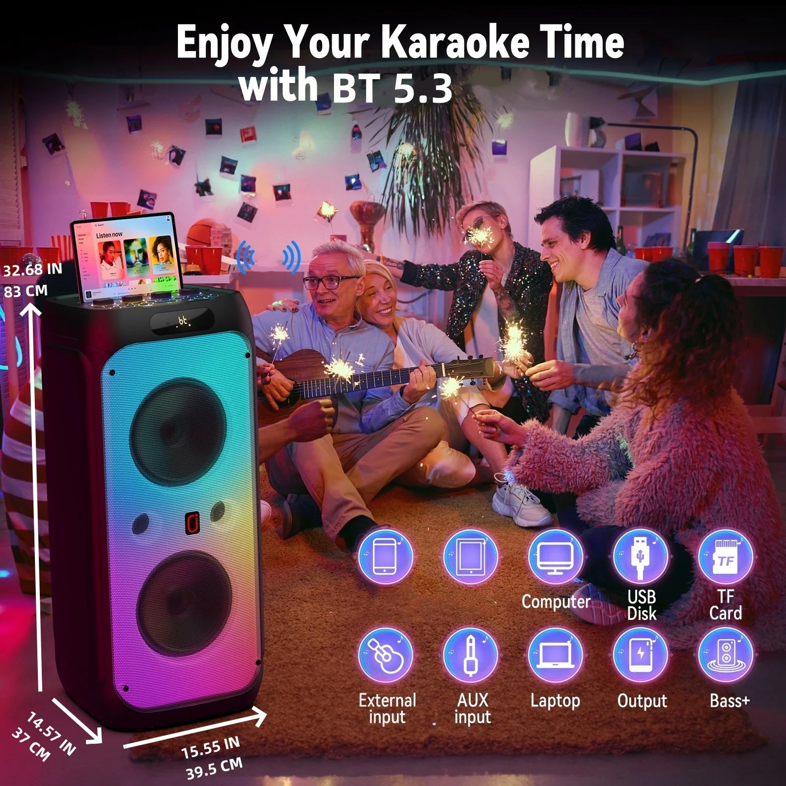 FanFun Karaoke Machine, 33" Big Bluetooth Party Speaker with 500W Peak Power, Wireless DJ PA Speaker with Subwoofers, Disco Lights & 2 Karaoke Microphones for Outdoor Home Party, Support USB/AUX/REC/TWS