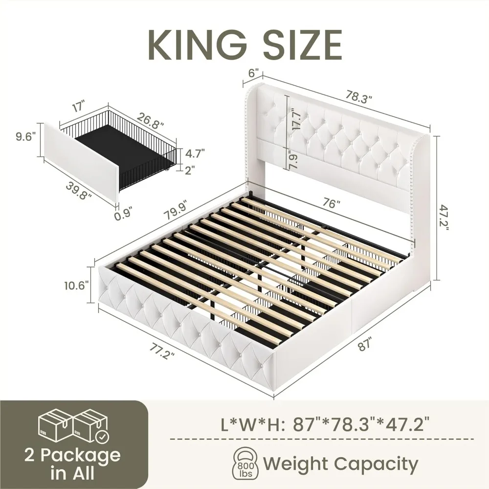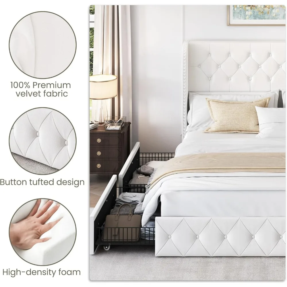King Size Bed Frame with 4 Storage Drawers and Wingback Headboard Velvet Upholstered Platform Bed Frame Tufted Beds with Wooden