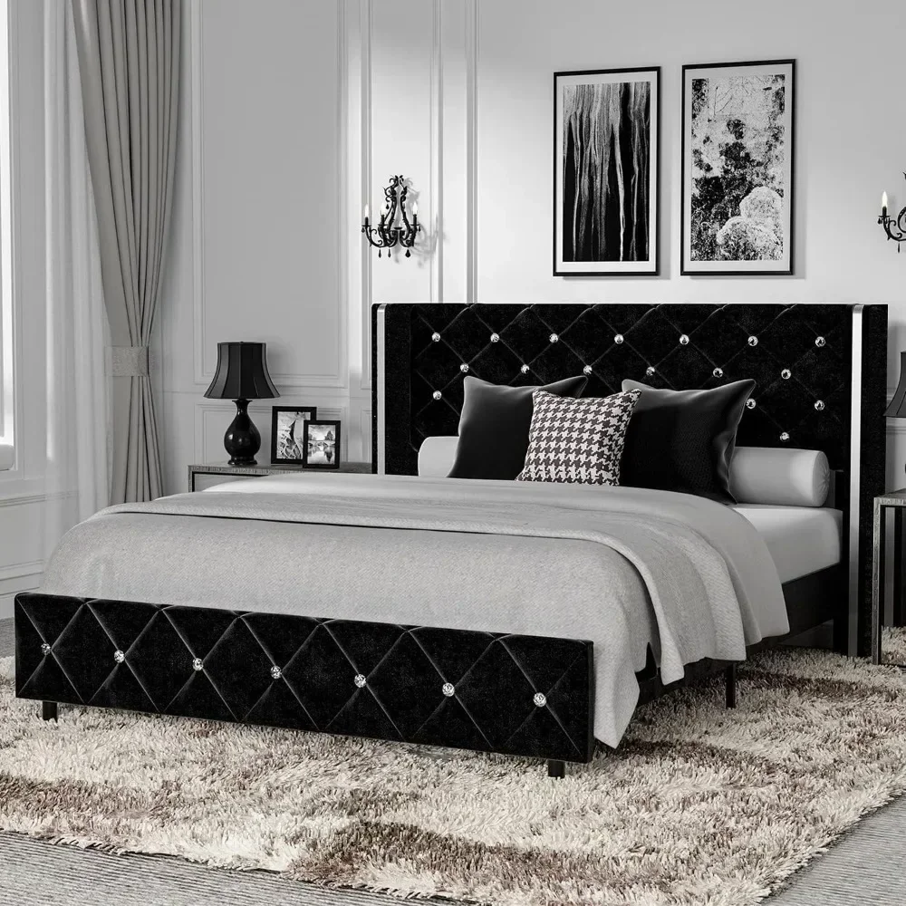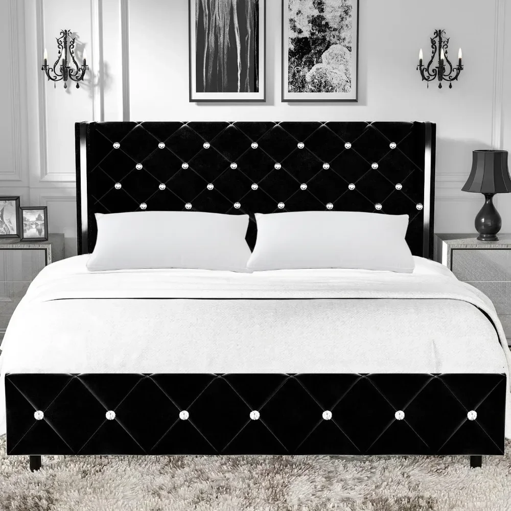 King Size Bed Frame with Wingback, Upholstered Beds Frames with Diamond Tufted Headboard and Footboard, No Box Spring Needed