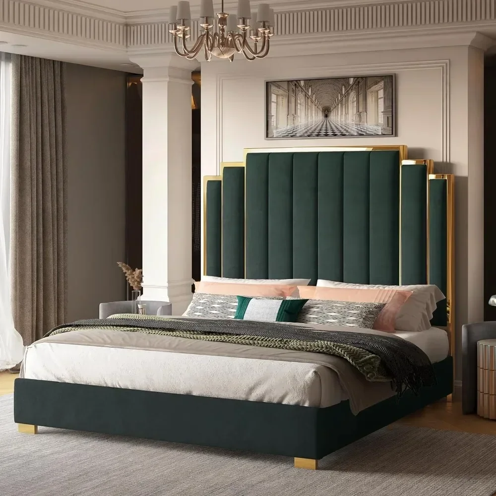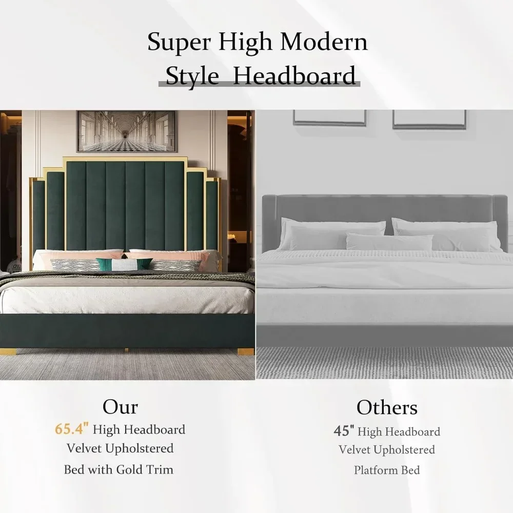 King Size Platform Bed Frame, 65" Velvet Upholstered Bed with Gold Trim Headboard/Wooden Slats/No Box Spring Needed/Green