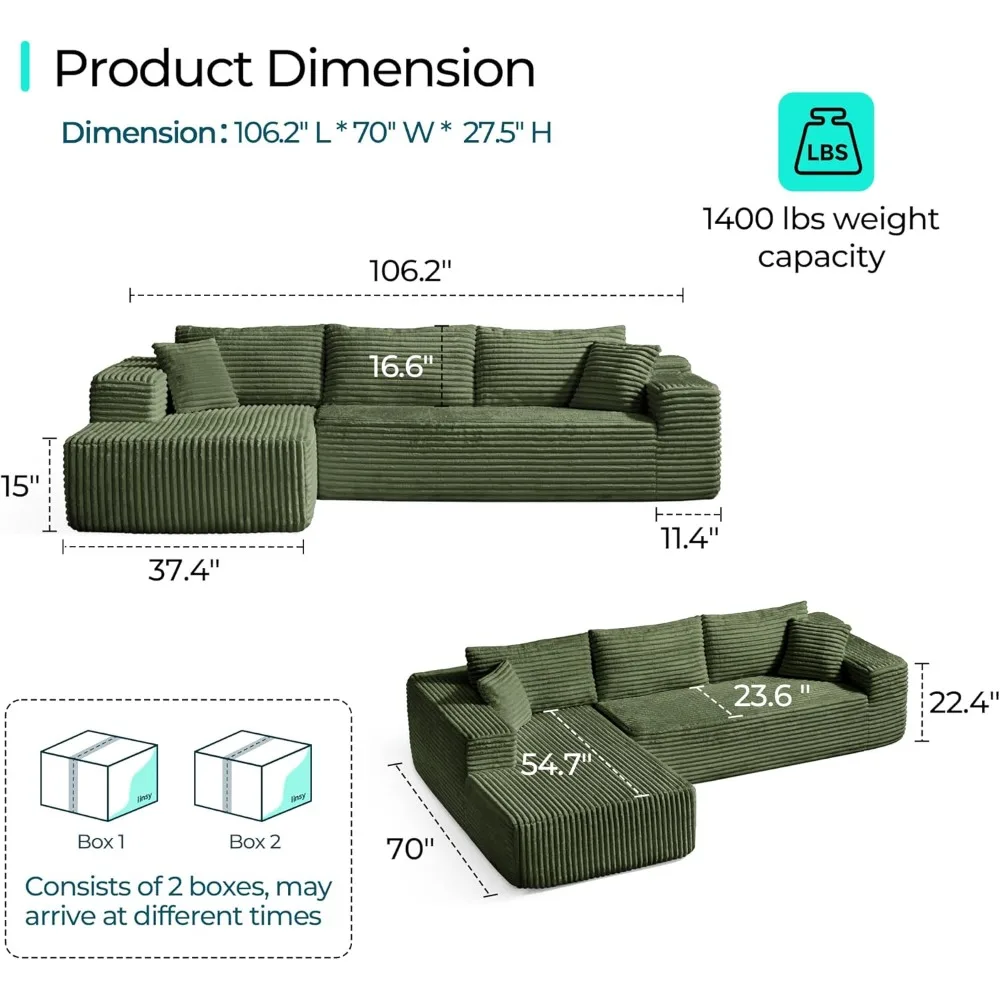 Modular Sectional Sofa: 106'' Corduroy Cloud Couch L Shaped Sofas with Deep Seat Comfy Fluffy Plush Couches for Living Room Apa